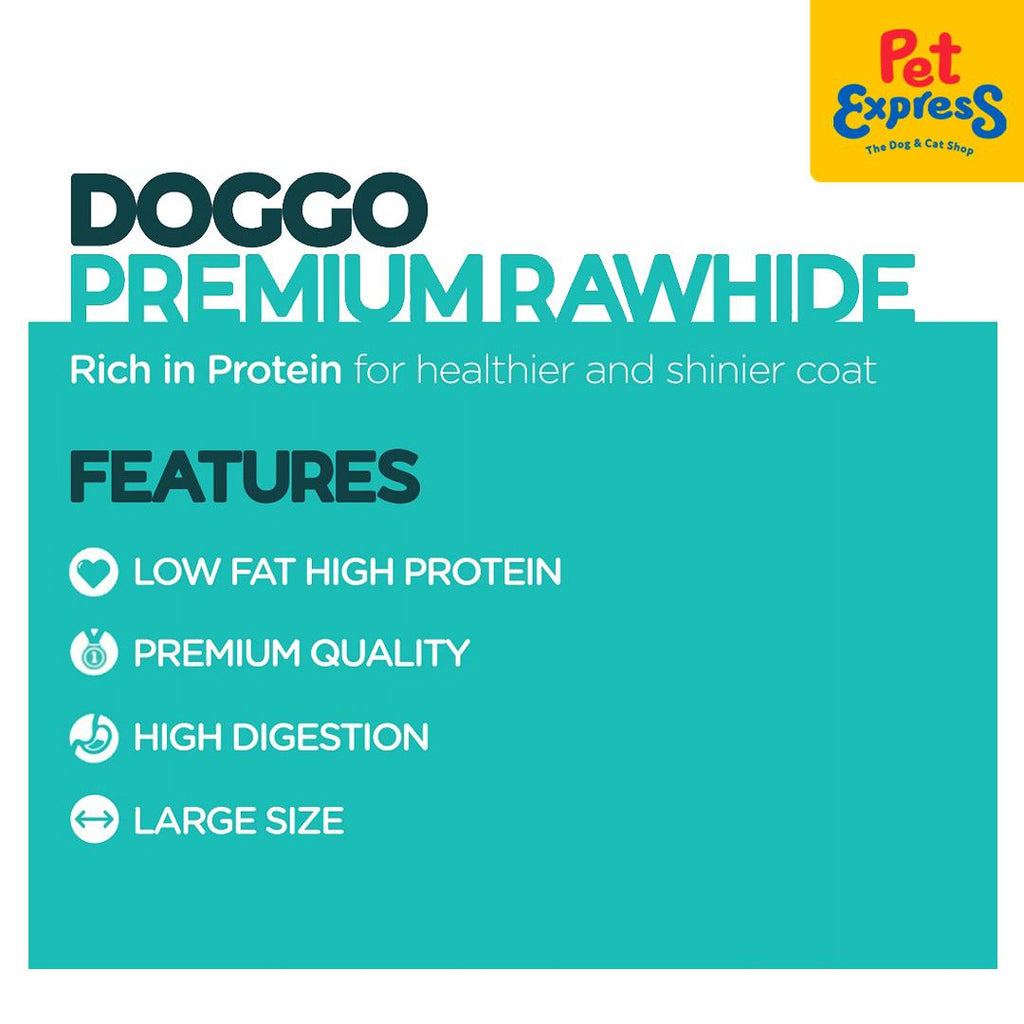 Doggo Premium Rawhide Knotted Beef flavor Large size 2 pieces per pouch Weight - 200g Low fat and high protein Premium quality High digestion Shiny coat Paw-fectly made!