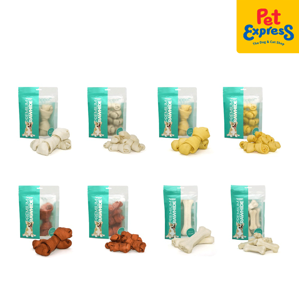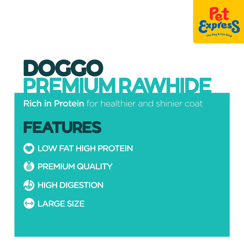 Doggo Premium Rawhide Knotted Chicken flavor Small size 6 pieces per pouch Weight - 200g Low fat and high protein Premium quality High digestion Shiny coat Paw-fectly made!