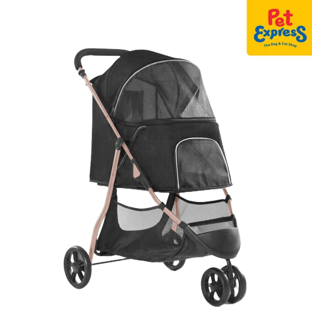 This black and gold dog stroller blends style and practicality. Providing a comfortable, secure ride for pets of all sizes. With a durable, weather-resistant frame and mesh windows for optimal ventilation. It ensures your pet stays cool and comfortable. The smooth-rolling wheels make it easy to navigate various terrains, while the lightweight design allows for effortless control. Ideal for outdoor walks and trips, this sleek stroller offers both functionality and elegance for you and your pet.